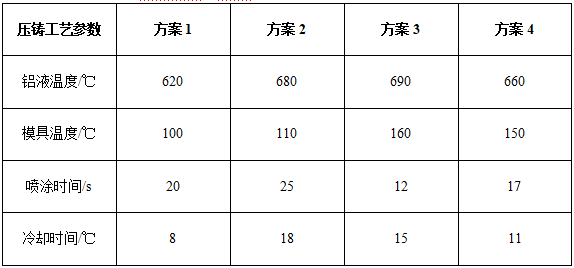 圖2 模流分析 模流分析結果表明:①按照以上澆注方案,高壓油道長抽芯針在壓鑄成形過程中受到幾股鋁液同時的沖擊作用。根據受力平衡,只要此長抽芯針定位足夠穩定,強度足夠高,可以避免在壓鑄成形過程中由于鋁液對其沖擊而導致的變形和偏擺。②從填充率為100%的溫度場可以看出,高壓油道長抽芯針所受溫度分布比較均勻,溫度梯度不明顯。同時生產過程中還可以通過調節鋁液溫度、模具溫度、噴涂時間、冷卻時間來削弱溫度場對高壓油道長抽芯針變形和偏擺影響。 1.2 壓鑄工藝參數選擇 壓鑄工藝參數對鑄件品質非常重要,其中溫度對高壓油道長抽芯針影響最大。當溫度過低時,高壓油道長抽芯針所受內外溫差大,鋁液就會對其產生強烈的沖擊,受到沖擊后很容易變形、開裂受損。當有高溫的鋁液注入時,長抽芯針的溫度會迅速上升,進行冷卻時,此處鋁液冷卻速度緩慢,導致鑄件會有縮孔、縮松等缺陷出現,使鑄件質量受到嚴重的影響。因此控制好高壓油道長抽芯針溫度不僅影響鑄件品質,而且對其變形和偏擺也有影響。其他條件控制不變,通過調節鋁液溫度、模具溫度、噴涂時間、冷卻時間來看鑄件內部質量以及高壓油道長抽芯針表面燒傷粘鋁。