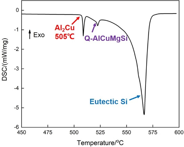 圖2 擠壓鑄造試棒橫截面微觀組織均勻性 圖3為擠壓鑄造Al-Si-Cu-Mg合金高倍微觀組織。可以看出,合金微觀組織主要由黑色的α-Al相、灰色的共晶Si相以及白色的θ-Al2Cu、Q-AlCuMgSi相組成,其中兩種含Cu相的能譜測試結果見圖3e、圖3f。θ-Al2Cu、Q-AlCuMgSi相主要沿α-Al的晶界分布,通過圖3c、圖3d可知,θ-Al2Cu、Q-AlCuMgSi相主要呈現短桿狀和塊狀,另外合金中的共晶Si主要呈現細小絨毛狀,熔煉過程的Sr變質對共晶Si相起到了良好的變質細化作用,細小的共晶Si形態有利于固溶處理過程Si顆粒的球化分散以及力學性能的提高。 圖4為鑄態Al-Si-Cu-Mg合金的升溫DSC曲線。可以看出,在505 ℃的位置出現了θ-Al2Cu相的吸熱熔化峰,而后在約525 ℃出現了Q-AlCuMgSi相的吸熱熔化峰,之后在570 ℃左右出現了共晶Si的熔化峰。DSC的結果表明,合金的固溶溫度最高不能超過505 ℃,所以T6處理試驗以此為依據,并考慮熱處理可能出現的溫度波動,設定固溶溫度為495 ℃。