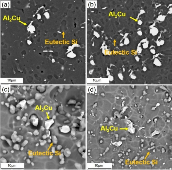 (a) SEM圖1, (b) SEM圖2; (c) 含Cu相與Si顆粒1, (d)含Cu相與Si顆粒2