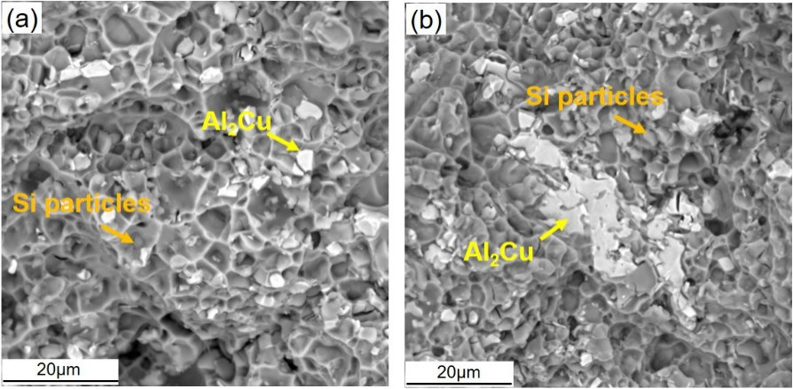 (a) 3號試樣 (b) 4號試樣 3、結論 (1)擠壓鑄造Al-Si-Cu-Mg合金試棒橫截面的組織分布較為均勻,Cu和Mg在中主要形成θ-Al2Cu、Q-AlSiCuMg相,T6熱處理后,含Cu相與共晶Si相出現了明顯的球化現象,Cu與Mg在固溶處理過程中向基體中回溶。 (2)擠壓鑄造Al-Si-Cu-Mg合金在T6處理后,屈服強度與抗拉強度有顯著提高,分別達到375 MPa和423 MPa,伸長率為7%~9%,顯現出良好的強韌性指標,T6處理后,合金中主要析出了θ'以及β''納米強化相,有效強化了合金的力學性能,同時T6處理后彌散均勻的共晶Si顆粒以及含Cu相又有利于合金韌性的提高。