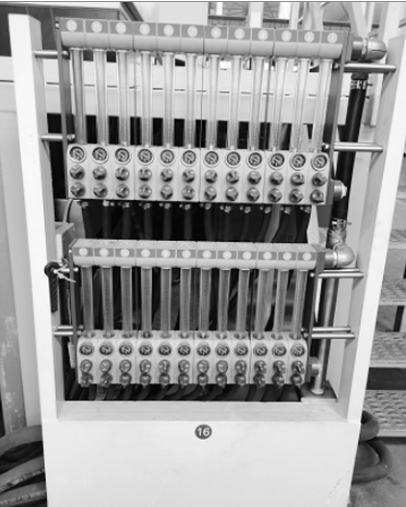 表1 材料力學性能 2.3 冷卻水智能控制 由圖3溫度場數據分析得出,鑄件G區的溫度最高,對鑄件質量影響最大,只要控制G區的溫度,整個鑄件內部質量就基本解決,將熱電偶安裝在3D打印鑲件G區的相反面檢測模具溫度效果最佳,如圖5所示,熱電偶在3 ms內將溫度變化產生的熱電勢信息轉換成溫度數字信號,通過熱電偶插頭與圖6所示壓鑄機連接,壓鑄機將接收到的溫度信號放入儲存器中并與模具溫度設定值進行比對,當模具溫度超過設定上限205℃時,如圖7所示,三組并聯的冷卻水控制電磁閥全部打開,模具冷卻水流量增加如圖8所示,模具溫度迅速下降;當模具溫度低于設定下線190 ℃時,三組并聯的電磁閥依次關閉直到模具溫度值上升到設定范圍內后,不再關閉其余電磁閥,實現了模具溫度動態平衡,如圖9所示。