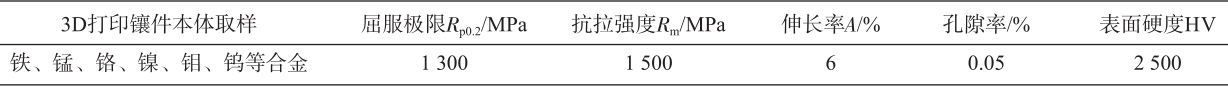 圖4 3D打印鑲塊 2.2 合金粉末選擇 選取以鐵、錳、鎳、鉻、鉬、鎢等為主要成分的高純凈度、高流動性、高球形度的合金粉末,采用激光熔融沉積法來制作3D隨形冷卻水道鑲件,經過熱等靜壓、真空淬火、固溶退火、精密加工、表面激光涂層處理,3D打印的鑲件本體力學性能見表1。