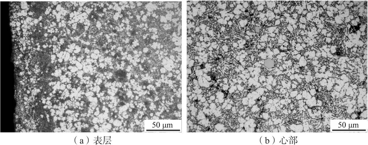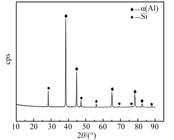 根據(jù)熱傳導的物理規(guī)律,在進行熱傳導時物體內(nèi)部的溫度場會隨時間發(fā)生變化,這使得直接測量熱導率有一定困難。本文在測量合金的密度、比熱容以及熱擴散系數(shù)的基礎上,采用式(1)計算出合金的熱導率 2、鋁合金ZL102壓鑄組織 濾波器殼體由鋁合金ZL102壓鑄而成,由表1得出合金中硅含量為12.8%(質量分數(shù),下同),該成分接近鋁硅二元合金共晶成分(Al-Si二元平衡相圖中共晶成分點Si含量為12.6%),合金凝固時主要發(fā)生共晶反應L→α(Al)+β(Si),形成大量的α(Al)+ Si共晶組織。然而,由于壓鑄工藝下合金冷卻速率高,凝固過程遠離平衡態(tài),因此鋁合金ZL102室溫下壓鑄組織中存在的物相包括初生α(Al)、鋁硅共晶組織、初晶硅以及少量的金屬間化合物。如圖2顯示了采用OM得到的壓鑄件表層及心部顯微組織,其中灰白色的基體為初生α(Al),在基體之間分布有大量灰黑相間的鋁硅共晶組織,以及針狀/板條狀的初晶硅。對比圖2a與圖2b,表層組織更加細小均勻,這是由于壓鑄件在成形時表層直接接觸模具型壁,合金冷卻速率高、過冷度大,使得表層組織中晶粒更加細小均勻。此外,壓鑄件心部組織中還發(fā)現(xiàn)了少量大塊的灰色多邊形組織,如圖2b所示,由于合金成分中含鐵量稍高,初步判斷其為某含鐵物相。采用X射線衍射(XRD)測試合金物相組成,掃描范圍為10°~90°,掃描速度為4°/min,將測試結果導入MDI Jade 6進行分析,結果如圖3所示。由XRD檢測結果可知,合金中只存在α(Al)與Si相,并未檢測到含鐵金屬間化合物等,造成上述情況的原因可能是合金中金屬間化合物的含量較低,導致XRD并未檢測到。
