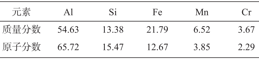 圖3 壓鑄鋁合金ZL102的XRD圖譜 采用SEM進一步對上述多邊形物相進行分析,如圖4所示。基于能譜儀(EDS)結果(表2),推測其為一種復雜的AiSiFeMn四元金屬間化合物。結合部分文獻如袁、王等判斷該物相為α-Al 15 (Mn、Fe) 3 Si 2 ,該物相是在β-Al 5 FeSi 相基礎上加入Mn元素后進一步演變而成。在β-Al 5 FeSi 相形成時,部分Mn原子奪去了Fe原子在β相中占據(jù)的位置,相當于Mn原子部分替代Fe原子,從而形成了AlSiFeMn四元復合相。