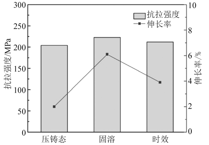 圖5 壓鑄態(tài)、固溶及時效組織的對比分析 4、熱處理對力學性能及導熱性能的影響 不同熱處理工藝下的壓鑄鋁合金ZL102力學性能如圖6所示,可以看到,在強度與伸長率方面,固溶處理后的試樣優(yōu)于壓鑄態(tài)及時效處理的試樣,其抗拉強度與伸長率分別為222.8 MPa與6.1%,相比壓鑄態(tài)抗拉強度提高了9.2%,伸長率得到明顯改善,提高了205%,而時效態(tài)的試樣力學性能居中。分析原因,盡管已有研究認為,由于氣孔的存在普通壓鑄件不適合進行熱處理,且鋁合金ZL102為非熱處理強化合金,但固溶處理過程中硅相的熔斷和球化顯著改善了其對α(Al)基體的割裂作用,減少了合金承載時在周圍產(chǎn)生的應力集中,有利于合金強度及伸長率的提高。進一步時效處理,合金力學性能相比固溶態(tài)反而發(fā)生了一定的下降,其原因在于α(Al)晶界及固溶體中析出的硅相進一步聚集長大發(fā)生粗化現(xiàn)象,損害了合金的力學性能,且合金時效過程中并沒有析出時效強化相。