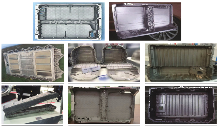 圖6 三種車型動(dòng)力及傳動(dòng)系統(tǒng)的壓鑄件應(yīng)用指數(shù) 電動(dòng)車雖然在動(dòng)力和傳動(dòng)系統(tǒng)方面壓鑄件的用量減少,但在三電系統(tǒng)中增加了壓鑄件的用量,可以部分的彌補(bǔ)動(dòng)力和傳動(dòng)系統(tǒng)壓鑄件用量的減少,典型的應(yīng)用是電池托架,如圖7所示。電動(dòng)車的不斷增加,電池箱和電機(jī)外殼的平均用鋁量將快速增長(zhǎng),電池箱用鋁量占未來鋁用量平均增量的近三分之二。為增加電池容量,目前車載電池的尺寸較大,電池托架的尺寸較大,有的型號(hào)長(zhǎng)度尺寸可達(dá)2 m,使用的壓鑄機(jī)大多都在4 000 t以上,最大可達(dá)萬噸級(jí)的要求。此外,電機(jī)殼、端蓋、轉(zhuǎn)子、接線盒外殼等也采用壓鑄工藝生產(chǎn),對(duì)壓鑄件用量有所彌補(bǔ),見圖8。