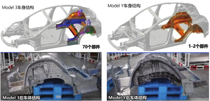 圖8 電動(dòng)車驅(qū)動(dòng)系統(tǒng)壓鑄件 如果使用雙電機(jī)驅(qū)動(dòng),則對(duì)壓鑄件用量的彌補(bǔ)作用更強(qiáng)。 2.3 推動(dòng)一體化壓鑄技術(shù) 在減重、提效和降本的多重壓力下,2019年特斯拉提出了車身一體成形鑄造方法。采用一體成形壓鑄的方式生產(chǎn)Model Y的整個(gè)后部車體,將原先由多工序所需的70多個(gè)零件集成為1個(gè),減少了組裝焊接等程序,減重約30%,降低制造成本約40%。Model Y 的一體壓鑄后車身僅重 66 kg,比尺寸更小的 Model 3 同樣部位輕了10~20 kg,見圖9。特斯拉Model Y4680的CTC版本將應(yīng)用2-3個(gè)大型壓鑄件替換由370個(gè)零件組成的整個(gè)下車體總成,重量將進(jìn)一步下降10%,對(duì)后續(xù)里程可增加14%。目前,也有壓鑄廠家在策劃或?qū)嵤┮惑w化壓鑄汽車底盤或滑板式汽車底盤,見圖10及圖11。如果采用一體化全鋁壓鑄車身,重量將在200~250 kg,而同級(jí)別鋼制車身的重量在350~450 kg,重量降低約150~200 kg。