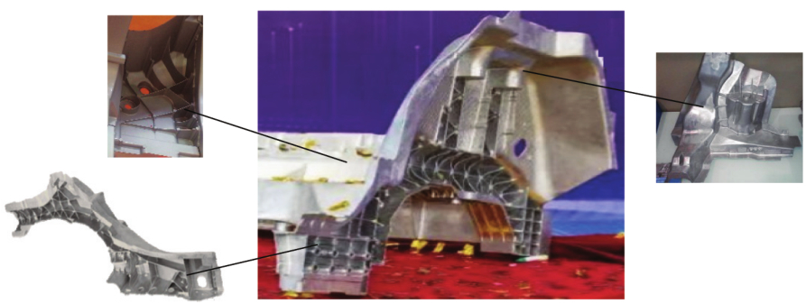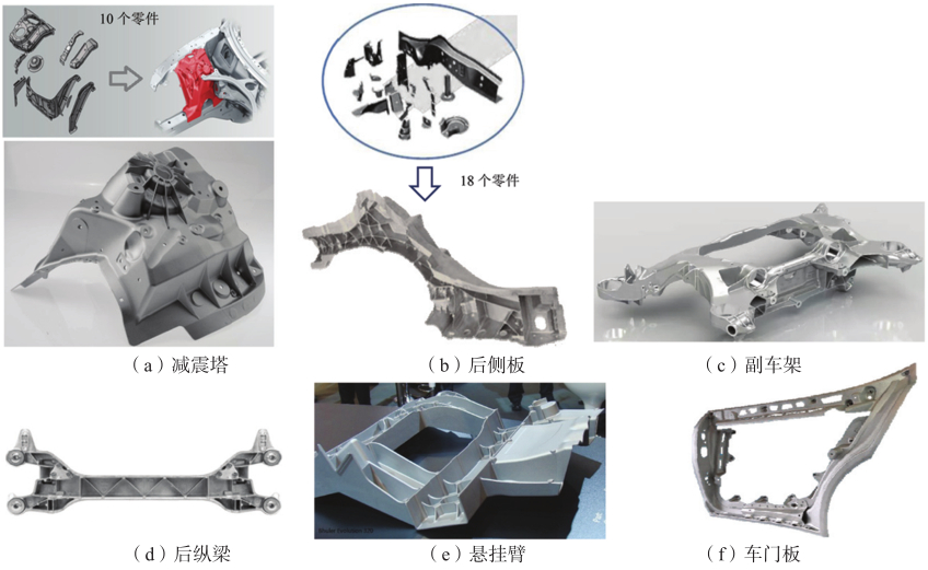 圖4 壓鑄件產(chǎn)量與汽車產(chǎn)量走勢(shì) 目前,汽車結(jié)構(gòu)件壓鑄生產(chǎn)技術(shù)已經(jīng)取得長(zhǎng)足進(jìn)步,從初期的A柱、減震塔等結(jié)構(gòu)件批產(chǎn)后,已經(jīng)擴(kuò)展至后側(cè)梁、副車架等工藝難度比較大的結(jié)構(gòu)件,典型的結(jié)構(gòu)件見圖5。其中減震塔原為10個(gè)零件組成,改為壓鑄工藝生產(chǎn)后集成為一件。后縱梁原為18個(gè)零件組成,壓鑄后集成為一件。副車架壓鑄工藝難度大,此前大部分采用低壓工藝或重力工藝,改為壓鑄后,形狀及尺寸精確,壁厚減薄,重量減輕,大幅提高生產(chǎn)效率。懸掛臂和后縱梁等鑄件性能要求比較高,一般需要進(jìn)行熱處理。目前,結(jié)構(gòu)件壓鑄基本上采用真空壓鑄,保證鑄件的可熱處理和可焊接性能。