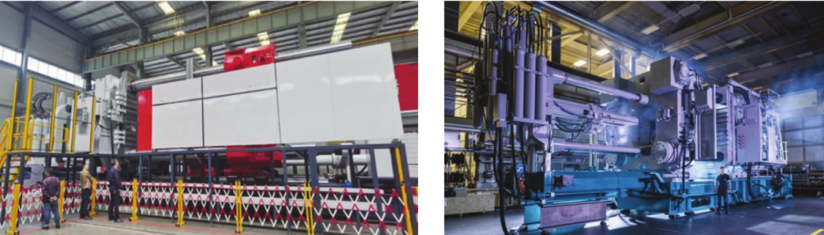 圖12 一體化壓鑄的高度集成 2.4 推動(dòng)超大型壓鑄機(jī)市場(chǎng) 多大噸位的壓鑄機(jī)屬于超大型壓鑄機(jī)在專業(yè)上并沒有嚴(yán)格定義,一般認(rèn)為能夠壓鑄車身大型一體化后部件的壓鑄機(jī)就認(rèn)為是超大型壓鑄機(jī),合模力在6 000 t以上。一體化車身壓鑄件重量一般可達(dá)60余公斤,澆注重量可達(dá)100余公斤,尺寸約為1 700 mm× 1 500 mm×800 mm,重量和尺寸都超出了壓鑄產(chǎn)品的極限。在此背景下,制造超大型壓鑄機(jī)成為必然。大型一體化壓鑄開啟了壓鑄機(jī)超大型化的時(shí)代,一體化壓鑄概念提出的短短3年中,壓鑄機(jī)制造企業(yè)快速研發(fā),6 000 t超大型壓鑄機(jī)已用于生產(chǎn)汽車部件一體化壓鑄。8 000 t級(jí)、9 000 t級(jí)超大型壓鑄機(jī)已經(jīng)進(jìn)入市場(chǎng)并可在短時(shí)間內(nèi)形成生產(chǎn)能力,15 000 t級(jí)也已進(jìn)入研發(fā)設(shè)計(jì)階段,圖13為9 000 t級(jí)壓鑄機(jī)。汽車主機(jī)廠對(duì)一體化壓鑄的認(rèn)可將會(huì)使一體化壓鑄進(jìn)一步普及,大型壓鑄機(jī)市場(chǎng)需求將會(huì)進(jìn)入常態(tài)化需求,持續(xù)存在。