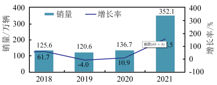 圖2 近年中國(guó)新能源汽車銷量及增長(zhǎng)率