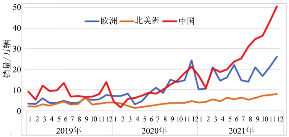 圖1 中國(guó)和歐洲、北美洲新能源汽車銷量走勢(shì)