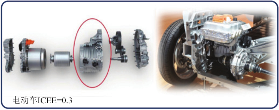 圖5 典型的結(jié)構(gòu)件 2.2 壓鑄件應(yīng)用轉(zhuǎn)換 壓鑄件在傳統(tǒng)燃油車與新能源汽車中有些部位的用量產(chǎn)生變化,壓鑄件用量有增有減,變化主要來自動(dòng)力系統(tǒng)和傳動(dòng)系統(tǒng)。在燃油車中,動(dòng)力和傳動(dòng)系統(tǒng)包括發(fā)動(dòng)機(jī)缸體、變速箱和離合器殼體等這部分壓鑄件用量比較大,發(fā)動(dòng)機(jī)約有16個(gè)壓鑄件,傳動(dòng)系統(tǒng)約有8個(gè)壓鑄件。但在電動(dòng)車中,驅(qū)動(dòng)系統(tǒng)約有4個(gè)壓鑄件,傳動(dòng)系統(tǒng)約有2個(gè)壓鑄件。電動(dòng)汽車與傳統(tǒng)燃油車相比,在動(dòng)力系統(tǒng)和傳動(dòng)系統(tǒng)中的應(yīng)用明顯減少。但新能源汽車中混合動(dòng)力汽車的動(dòng)力和傳動(dòng)系統(tǒng)包含了燃油和電動(dòng)兩套系統(tǒng),壓鑄件的用量有所增加。如果用ICEE(壓鑄機(jī)鎖模力(循環(huán)時(shí)間)表示壓鑄件的應(yīng)用指數(shù),大小及數(shù)量因素等),則燃油車、電動(dòng)車和混動(dòng)車的壓鑄件應(yīng)用指數(shù)如圖6所示。