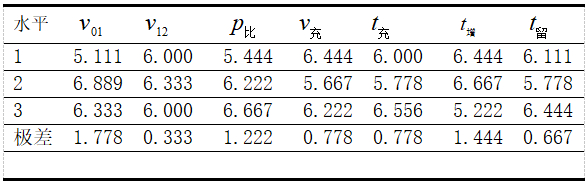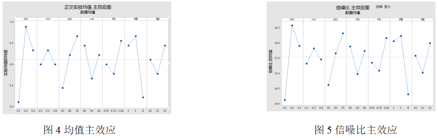根據圖4,通過正交計算,可以得出試驗均值響應表,詳見表6;根據圖5,通過正交計算,可以得出試驗信噪比響應表,見表7。