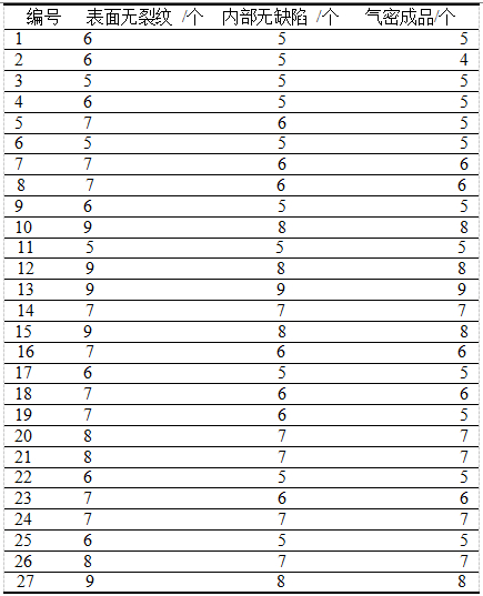 針對速度、比壓、時間等關鍵參數,采用正交試驗,以獲得優化的工藝參數。 4、試驗結果與分析 為了獲得準確可靠的數據,按照試驗工藝,每一組壓鑄10件薄壁殼體,通過田口DOE計算,獲得壓鑄A380合金殼體的最優工藝參數。 優化目標是表面質量、內部缺陷及氣密性。根據試驗及檢測結果,得到的數據見表5。對所有數據,輸入到Minitab軟件的設計表中,按照實驗條件與結果之間的關系,通過軟件自動獲得各個影響因素對結果的均值曲線,并根據均值曲線進行科學分析,獲得最優參數。