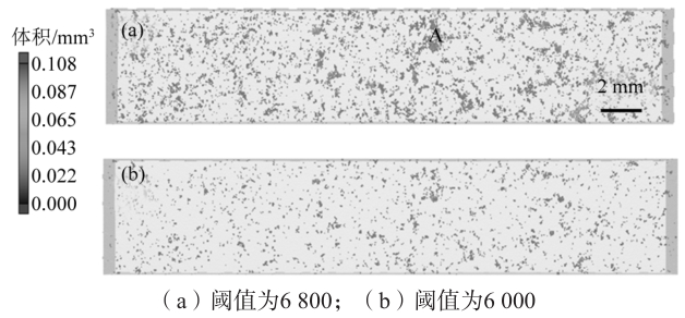 圖3 15號試樣中孔洞的CT形貌(A區域) 由于工業CT是使用X射線對樣品進行掃描后,再通過VGstudio軟件進行三維重構,因此軟件的后處理對CT結果的準確性有著重要影響。后處理軟件中的參數閾值對后處理的結果有著直接影響,選取不同的閾值,會得到不同的結果,如圖4所示(所掃描區域中灰度值大于閾值的部分被認為是材料,而低于閾值的部分被認為是孔洞,即圖4中的A區域)。同一個樣品,當選取閾值為6800和6000時,樣品所得的CT后處理結果差異明顯,圖4a中,樣品含有大孔洞與小孔洞混合,而圖4b中,樣品沒有大孔洞且分布均勻。可見,閾值對CT后處理結果有顯著影響。