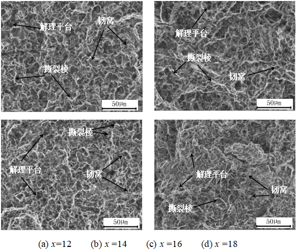 圖3 不同Zn含量下Al-Zn合金的伸長率 2.2 斷口形貌分析 圖4為不同Zn含量下Al-Zn合金的拉伸斷口形貌??梢钥闯觯辖鸬臄嗫诮M織主要由少量解理平臺、大量韌窩和撕裂棱組成。隨著合金中Zn含量增加,合金斷口組織中存在的韌窩數量和撕裂棱逐漸減少,解理平臺面積相對增多。Zn含量增加到18%后,斷口組織中的韌窩和撕裂棱數量達到最少,總體呈現脆性斷裂特征。
