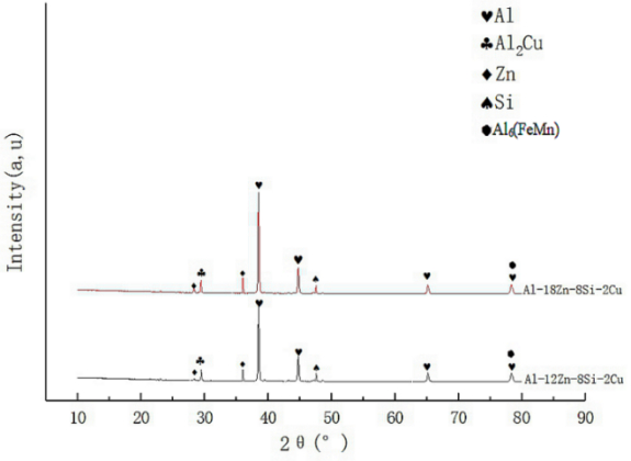 圖6 Al-xZn-8Si-2Cu合金的金相組織 2.5 XRD及EDS物相分析 圖7為不同Zn含量的Al-Zn合金XRD圖??梢钥闯觯珹l-xZn-8Si-2Cu合金主要由Al、Al2Cu、Zn、Si、Al6(FeMn)等5種相組成。隨著Zn含量的提高,Zn含量的變化對合金的相組成沒有影響,且不含Zn的相的峰值以及位置未發生變化,而含Zn相的峰值有所提高,峰強度增加。