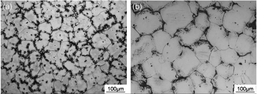 表1 WE43鎂合金機(jī)匣低壓熔模鑄造工藝參數(shù) 熔模鑄造的蠟?zāi)J褂媚A蠟橹袦厥灒扔脡合灆C(jī)在鋁合金壓型中制備出鑄件各個(gè)部位的蠟?zāi)#S后采用手工粘結(jié)的方式將蠟?zāi)=M裝成完整的模組,并對(duì)模組進(jìn)行檢查、矯形、修補(bǔ),保證尺寸的精確性。接著開(kāi)始制備型殼。型殼涂料是由320目的剛玉粉和硅溶膠粘結(jié)劑配制而成,面層掛砂材料為320目的剛玉粉和100目的剛玉砂,第二層掛砂材料為320目剛玉粉和46目的剛玉砂,背層掛砂材料為320目的鋁礬土粉和24目的煤矸石砂。最后將制備好的型殼放入焙燒爐中,在900 ℃下焙燒。焙燒工藝過(guò)程為升溫3 h,保溫2 h,隨爐冷卻12 h,以除去型殼中的殘余蠟料、有機(jī)物及水分。 采用應(yīng)變誘發(fā)熔化激活法制備GW94K觸變成形用半固態(tài)漿料。鑄錠經(jīng)500 ℃×8 h均勻化處理后,擠壓加工成30 mm棒材作半固態(tài)坯料,擠壓溫度為440 ℃,擠壓速度為 Φ 0.15 m/min,擠壓比為11.1。從擠壓棒材上切取約 Φ 26 mm×60 mm 圓柱樣品,在立式電阻爐加熱至給定半固態(tài)溫度,保溫5 min后,在一定壓力下將半固態(tài)漿料充型至預(yù)熱到200~300 ℃的模具中。 2、鑄造成形方法 目前,鑄造是鎂合金結(jié)構(gòu)零部件的主要成形方法,鑄件約占鎂合金構(gòu)件的90%,而鑄造成形方法會(huì)顯著影響材料的組織與力學(xué)性能。對(duì)比研究了金屬型鑄造和砂型鑄造WE54(Mg-5Y-2Nd-2Gd-0.5Zr,質(zhì)量分?jǐn)?shù),以下同)鎂合金的組織與力學(xué)性能,結(jié)果表明兩種成形方法鑄造的WE54合金具有相似的鑄態(tài)組織,如圖1所示,都是由等軸晶及沿晶界不連續(xù)分布的少量第二相組成。但是由于砂型鑄造的冷卻速度較慢,WE54鎂合金的組織更加粗大,力學(xué)性能低于金屬型鑄造。采用截線法可以確定金屬型鑄造WE54合金的平均晶粒尺寸約為92 μm,而砂型鑄造WE54合金的平均晶粒尺寸約為150 μm。金屬型鑄造和砂型鑄造樣品在峰值時(shí)效狀態(tài)下的抗拉強(qiáng)度分別為327 MPa和261 MPa,屈服強(qiáng)度分別為234 MPa和209 MPa。