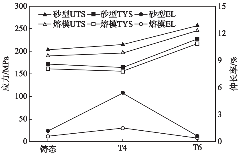 圖2 砂型鑄造和熔模鑄造WE43合金力學(xué)性能