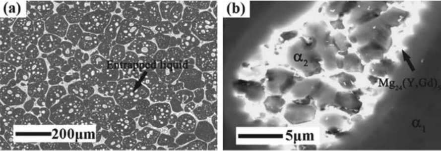 圖4 低壓熔模鑄造WE43鎂合金機(jī)匣外觀 另外,我們也研究了GW系列稀土鎂合金的半固態(tài)成形性能。半固態(tài)成形是指合金處于固液兩相溫度區(qū)間內(nèi)進(jìn)行鑄造(或鍛造)的一種近凈成形工藝,具有充型溫度低、鑄件缺陷少、材料組織均勻和力學(xué)性能優(yōu)異等優(yōu)點(diǎn),已經(jīng)成為工業(yè)上可供選擇的重要的成形方法。半固態(tài)成形方法主要有兩種,分別為流變成形和觸變成形,其中觸變成形是將固相坯料重新加熱到半固態(tài)溫度區(qū)間進(jìn)行壓鑄或者注射成形。合金在給定溫度下的液相分?jǐn)?shù)是半固態(tài)觸變成形過(guò)程中的重要冶金參數(shù),觸變成形工藝要求半固態(tài)合金的液相分?jǐn)?shù)在成形溫度區(qū)間內(nèi)隨溫度的變化不能過(guò)于劇烈,一般認(rèn)為0.3~0.5的液相分?jǐn)?shù)是觸變工藝最佳的成形溫度區(qū)間。 從熱力學(xué)相圖計(jì)算得到的半固態(tài)成形冶金參數(shù)來(lái)看,Mg-Gd-Y系合金在較寬的成分范圍內(nèi)都具有較好的觸變成形潛力。其中,GW94K(Mg-9Gd-4Y-0.5Zr)鎂合金是潛在的適合半固態(tài)觸變成形合金,且其觸變成形性能優(yōu)于AZ91鎂合金和A356鋁合金。GW94K鎂合金的成形溫度窗口為577~602 ℃,在此溫度區(qū)間合金的液相分?jǐn)?shù)的溫度敏感系數(shù)低于0.015 ℃﹣¹。 此外,試驗(yàn)對(duì)比研究了金屬型鑄造和半固態(tài)觸變成形GW94K鎂合金的顯微組織與力學(xué)性能。金屬型GW94K鎂合金主要由α-Mg基體和分布于晶界上不連續(xù)的網(wǎng)絡(luò)狀第二相Mg 24(Gd,Y)5 組成,同時(shí),組織中存在疏松缺陷。觸變成形GW94K鎂合金的組織由初始α-Mg及均勻分布的細(xì)小二次α-Mg和共晶Mg 24(Gd,Y)5相組成,其掃描電子形貌特征如圖5所示。半固態(tài)觸變成形可以顯著提高該合金的力學(xué)性能,尤其是塑性性能,室溫下固溶態(tài)的屈服強(qiáng)度、抗拉強(qiáng)度和伸長(zhǎng)率分別為148 MPa、228 MPa和17.6%,而金屬型鑄件室溫下固溶態(tài)的屈服強(qiáng)度、抗拉強(qiáng)度和伸長(zhǎng)率分別為124 MPa、200 MPa和5.3%,力學(xué)性能提高主要?dú)w因于疏松的消失以及細(xì)小脆性相Mg 24(Gd,Y)5 的均勻分布。