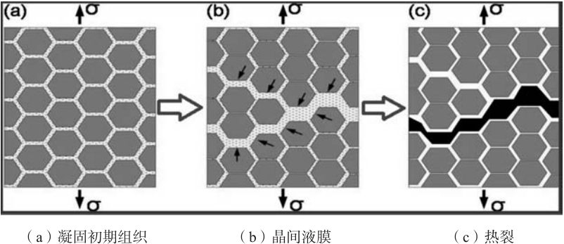 圖5 觸變成形GW94合金的SEM組織 3、鑄造缺陷 對(duì)于大型復(fù)雜鑄件,采用上述鑄造成形方法都不可避免會(huì)產(chǎn)生鑄造缺陷,其中熱裂和疏松是鎂合金中常見(jiàn)的兩種鑄造缺陷,對(duì)其形成機(jī)制、預(yù)測(cè)以及對(duì)力學(xué)性能影響等方面展開(kāi)了較為系統(tǒng)的研究。 采用一種改進(jìn)的“CRC”方法分別研究了含Zr和不含Zr在WE54合金砂型鑄件中熱裂缺陷的形成機(jī)理,研究表明鑄件中熱裂缺陷的形成機(jī)制為:鑄件熱節(jié)處的拉伸變形會(huì)引起殘余液相的流動(dòng)和富集,并在晶間形成液膜,而晶間液膜在足夠大的收縮應(yīng)力作用下會(huì)發(fā)生斷裂形成初始熱裂紋,初始熱裂紋繼續(xù)擴(kuò)展會(huì)在鑄件中形成熱裂缺陷,圖6為熱裂缺陷形成過(guò)程示意圖。