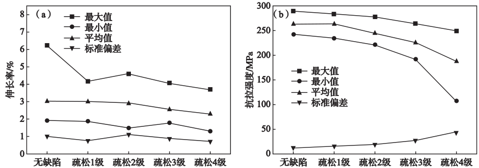 圖7 GW63K鎂合金室溫(a)伸長(zhǎng)率和(b)抗拉強(qiáng)度與疏松級(jí)別的關(guān)系