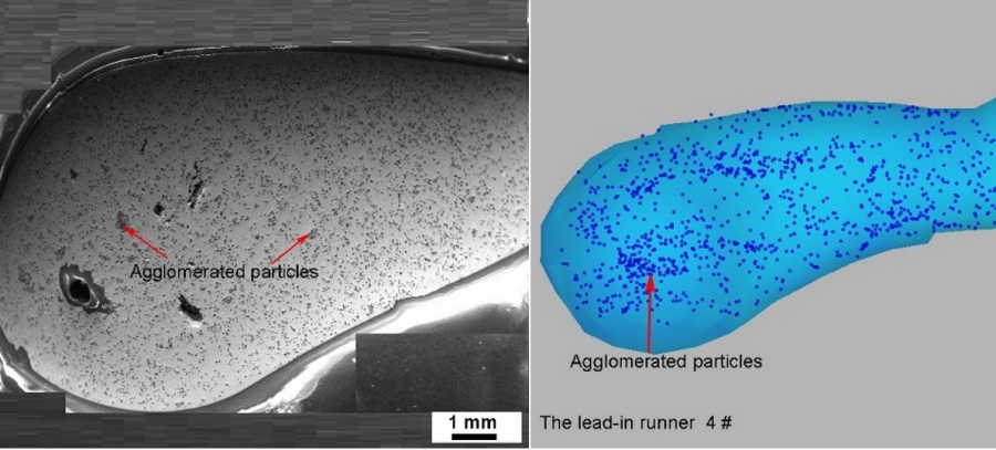 (a)實體鑄件(b)模擬鑄件 圖4為實際壓鑄與模擬壓室、溢流槽中顆粒分布對比。由圖4a~圖4d可見,鑄件溢流槽中顆粒數(shù)量較多,出現(xiàn)了顆粒團聚及局部區(qū)域顆粒稀少現(xiàn)象,試驗與模擬鑄件中顆粒分布規(guī)律較符合。由圖4e和圖4f可見,模擬鑄件壓室中顆粒分布相對較為均勻,而試驗鑄件壓室內(nèi)存在大尺寸的團簇顆粒,等效直徑約為400μm。這是由于所構(gòu)建的數(shù)學模型中,在參數(shù)設定時沒有考慮攪拌制備過程形成的顆粒團聚現(xiàn)象,設定顆粒相均勻分布于壓室前端,且由于壓室中顆粒運動距離較短,受到熔體流動的影響較小,因此模擬結(jié)果顯示壓室內(nèi)顆粒分布較為均勻。此外,將針對試驗鑄件壓室與其它位置處顆粒團聚特征的差異進行深入分析。