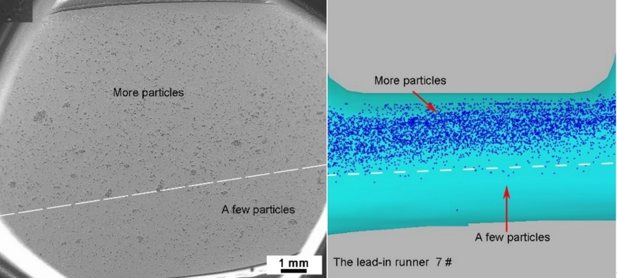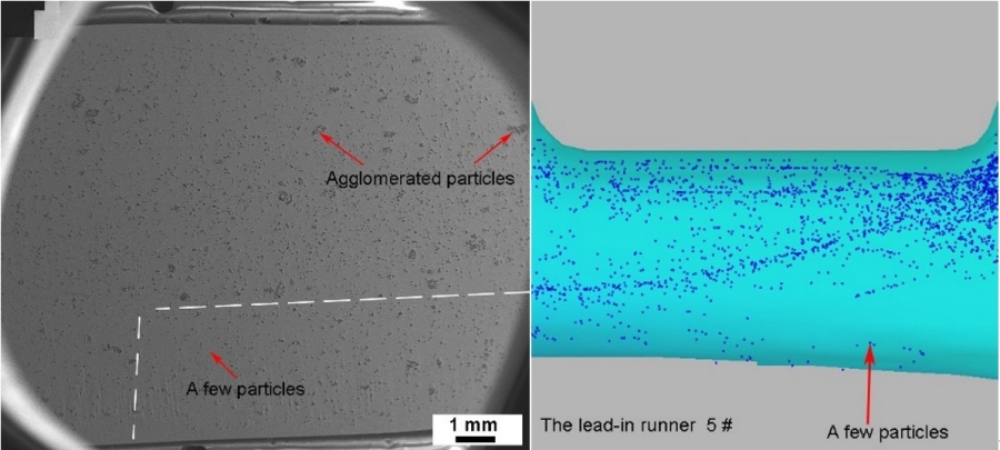 (c)分流道6和7位置 圖7為不同壁厚試樣與模擬的顆粒分布對比。由圖7a和b可見,2mm厚試樣中顆粒數(shù)量較少,顆粒分布較均勻。由圖7c和圖7d可見,隨著試件壁厚增大,試件中顆粒的數(shù)量逐漸增大,同時顆粒分布不均及團聚現(xiàn)象明顯增加,4mm厚試樣出現(xiàn)少量的團聚顆粒,但分布仍相對較為均勻。不同的是,6mm厚試樣顆粒出現(xiàn)條狀分布且團聚明顯,8 mm厚試件中團聚顆粒數(shù)量增大且趨向左側(cè),見圖7e~圖7h。上述對比分析表明,實際壓鑄與模擬的顆粒分布結(jié)果較為一致,所構(gòu)建的PAMCs壓鑄充型過程的多相流數(shù)值模擬模型可靠有效。