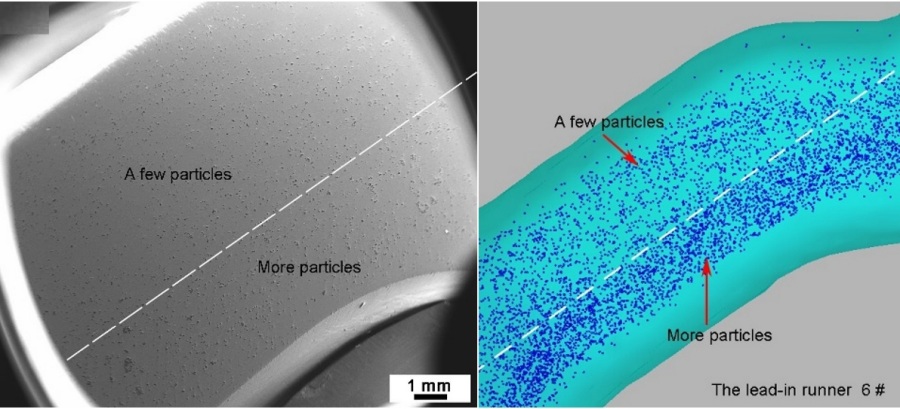 (e)實際壓鑄壓室 (f)模擬壓室 圖5為壓鑄試樣與模擬的分流道中顆粒分布對比。由圖5a和圖5b可見,鑄件分流道位置4處顆粒數(shù)量較多,且存在明顯的顆粒團聚現(xiàn)象,與模擬相符合。由圖5c和圖5d可見,鑄件 分流道位置5處顆粒數(shù)量較少,且右下方出現(xiàn)顆??瞻讌^(qū)域,這不同于文獻所描述的靠近型壁兩側(cè)附近均出現(xiàn)顆粒稀少現(xiàn)象。由圖5e~圖5h可見,鑄件分流道位置6和7處顆粒數(shù)量較多,且顆粒分布存在嚴重的分布不均現(xiàn)象,具體表現(xiàn)為位置6處上側(cè)顆粒數(shù)量較少,而下側(cè)顆粒數(shù)量較多,位置7處與位置6處的顆粒分布特征正好相反。上述對比分析表明,溢流槽和分流道中不同位置處的顆粒分布特征均存在較大差異,而研究充型過程中熔體的流動形態(tài)方可解釋上述現(xiàn)象。