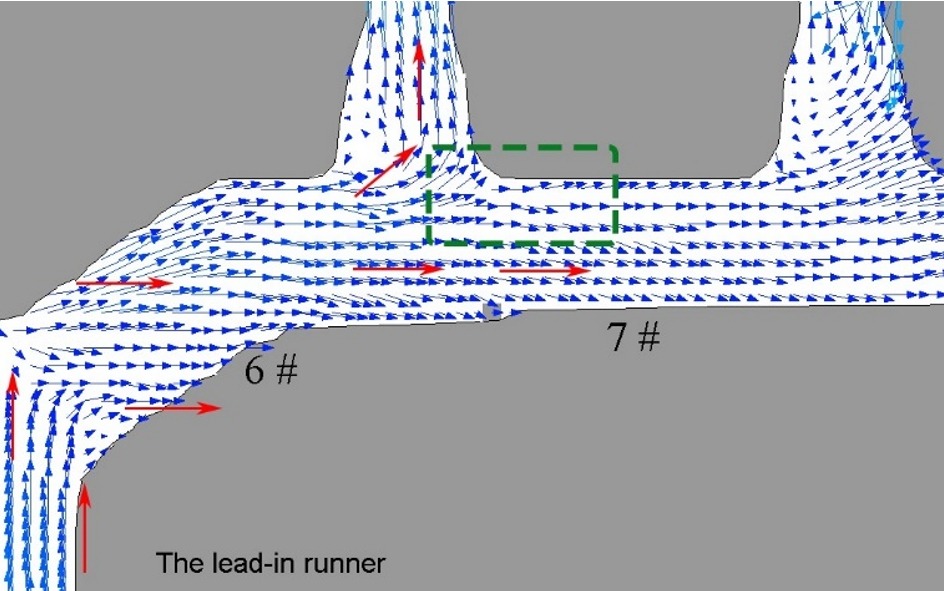 (g)實際位置7 (h)模擬位置7 圖6為數(shù)值模擬充型過程中不同位置處的速度矢量。由圖6a可見,溢流槽1和2處均形成了局部環(huán)流如圖中箭頭所示,由式(2)~(6)可知充型過程中顆粒所受的外力中流體作用力最大,且主要取決于流體的速度,速度越大時流體對顆粒的作用力也越大。因此,顆粒將伴隨熔體做環(huán)流運動,受流速變化的影響發(fā)生碰撞的幾率增大,從而易產(chǎn)生團聚現(xiàn)象,導致溢流槽1和2處顆粒團聚明顯(見圖4a~圖4d)。但在不同溢流槽中,顆粒的分布形態(tài)仍然存在明顯差異,這是由于溢流槽1形成了1處局部環(huán)流,而溢流槽2形成了2處局部環(huán)流,從而增大了顆粒碰撞幾率。由圖6b可見,分流道末端位置4處的熔體流速較小,截面縮收處出現(xiàn)逆向流并形成了局部環(huán)流,導致顆粒進入后被截留,該區(qū)域顆粒數(shù)量較多,并作環(huán)流運動產(chǎn)生碰撞團聚(見圖5a和圖5b)。同時,由圖6b可見,分流道位置5處,出現(xiàn)正向流和逆向流的交匯區(qū)域(方框標記處),顆粒被流體推擠與拖拽而發(fā)生分布不均現(xiàn)象(見圖5c和圖5d)。由圖6c可見,熔體流經(jīng)分流道位置6處時,與左上側(cè)型壁發(fā)生碰撞,熔體流向發(fā)生直角轉(zhuǎn)變,從而將顆粒推向分流道右下側(cè),導致顆粒分布不均(見圖5e和圖5f)。熔體流經(jīng)分流道位置6處后產(chǎn)生了分流,兩股分流的中間區(qū)域熔體流速較小且流向穩(wěn)定(方框標記處),顆粒容易在此中間區(qū)域發(fā)生淤堵與沉降現(xiàn)象,導致分流道位置7處顆粒分布不均,顆粒數(shù)量上側(cè)多而下側(cè)少(見圖5g和圖5h)。結(jié)果表明,復合材料壓鑄充型過程中形成的流場,對增強顆粒的分布具有重要影響,局部環(huán)流易導致顆粒發(fā)生碰撞團聚,而熔體流向發(fā)生劇烈變化易導致顆粒分布不均現(xiàn)象。