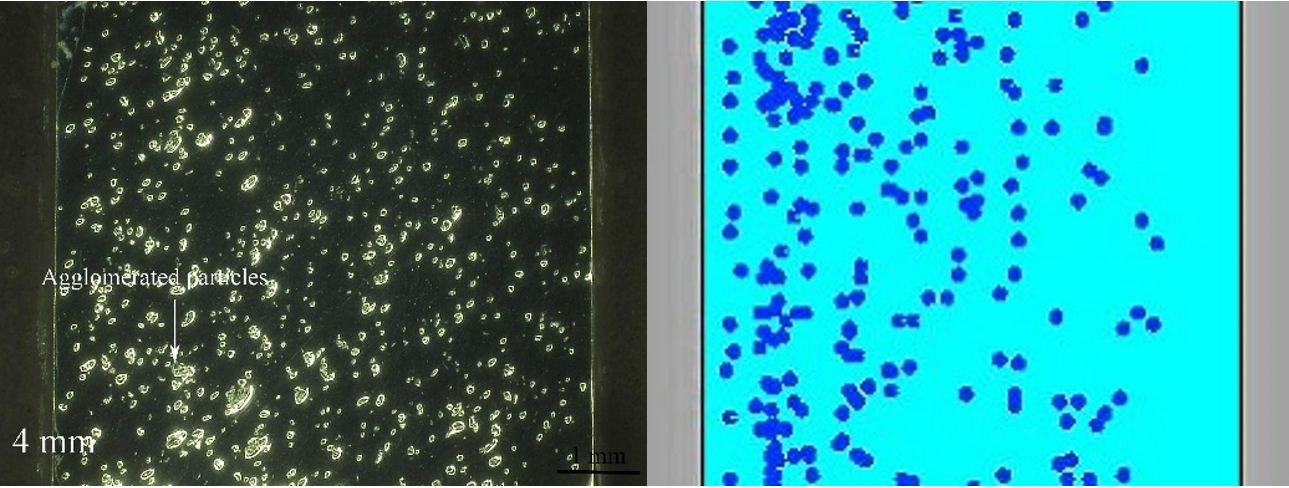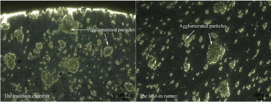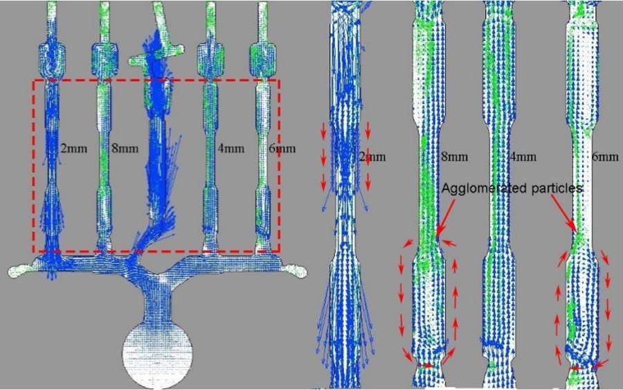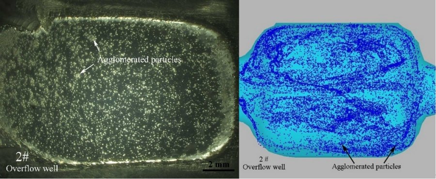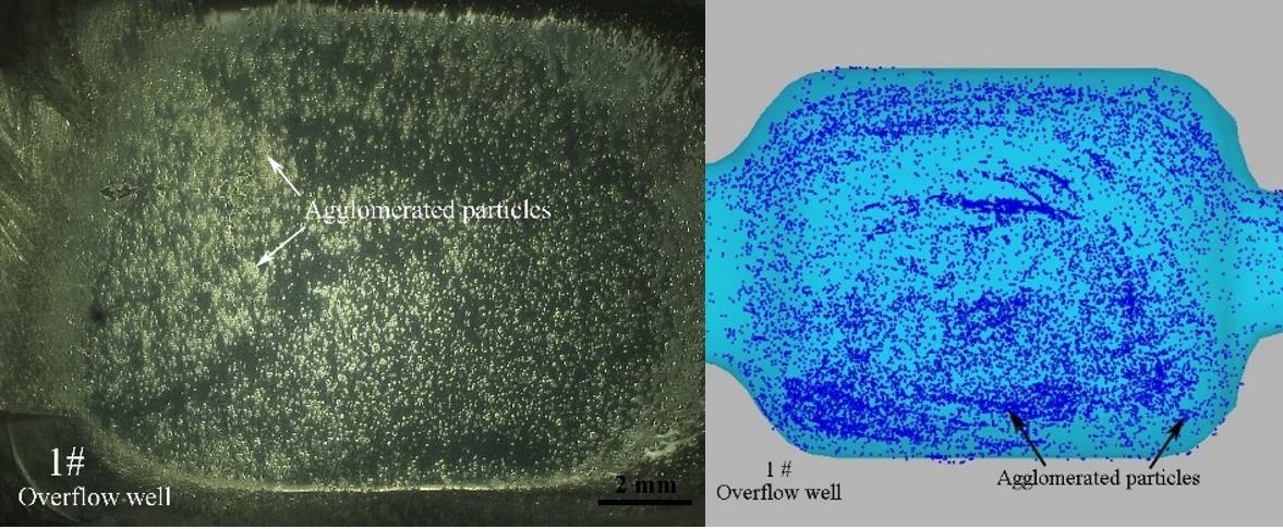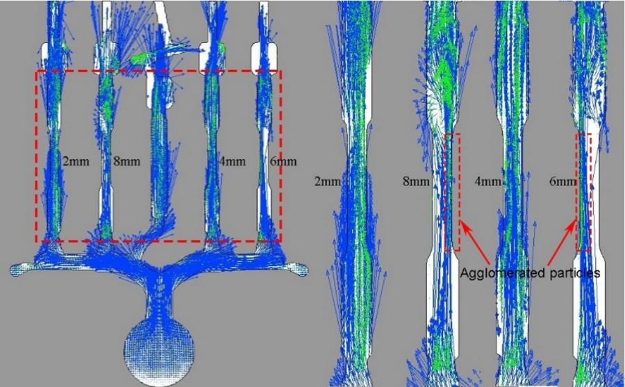 (4)2mm厚試件中熔體流向與流速變化較大,不利于顆粒沉降,導致試件中顆粒數(shù)量稀少;厚4mm試件中熔體流動平穩(wěn),有利于顆粒發(fā)生沉降及分布均勻;厚6mm和8mm試件易產(chǎn)生單側(cè)流和局部環(huán)流,導致顆粒分布不均及及團聚現(xiàn)象。 |