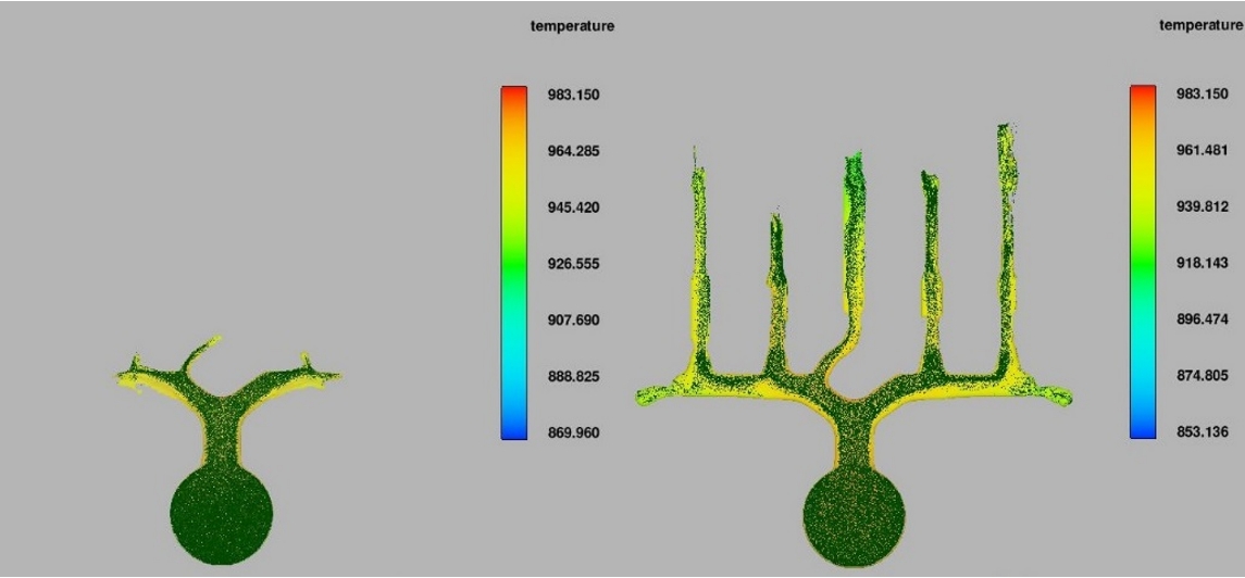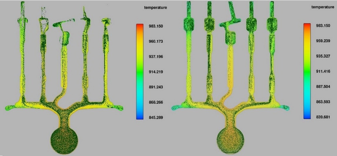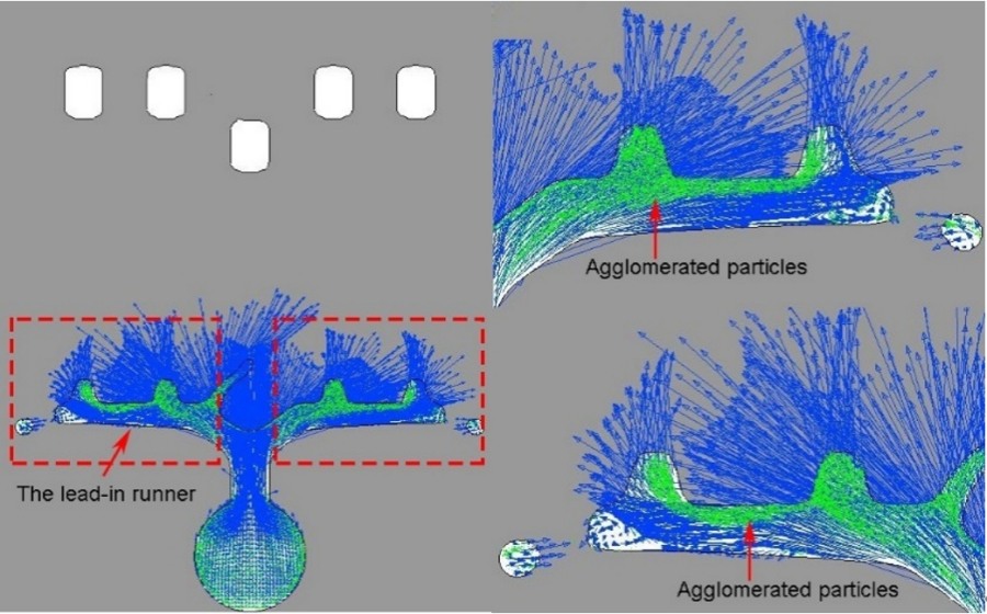 式中,μc為復合材料粘度,ρc為復合材料密度,u為熔體速度,?為普朗特流體混合長度,x為流體離型壁的距離。本研究中壓室與內(nèi)澆口截面積比為32:1,模擬結(jié)果顯示熔體通過內(nèi)澆口后速度急劇增大(見圖8a),產(chǎn)生強大的流體剪切力能夠?qū)㈩w粒團簇破碎分散。不同的是,數(shù)值模擬過程未能考慮復合材料熔體攪拌制備過程中所產(chǎn)生的顆粒團簇現(xiàn)象,因而壓室與分流道內(nèi)不存在大尺寸的顆粒團簇。此外,尚未探討顆粒對熔體粘度、導熱系數(shù)及熱焓等的影響,因此,后續(xù)研究將結(jié)合實驗調(diào)整上述相關物理性參數(shù),對所構(gòu)建的數(shù)學模型進行優(yōu)化。