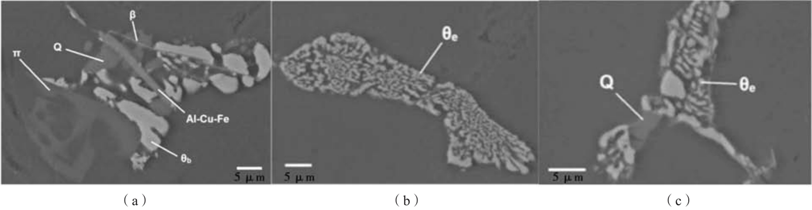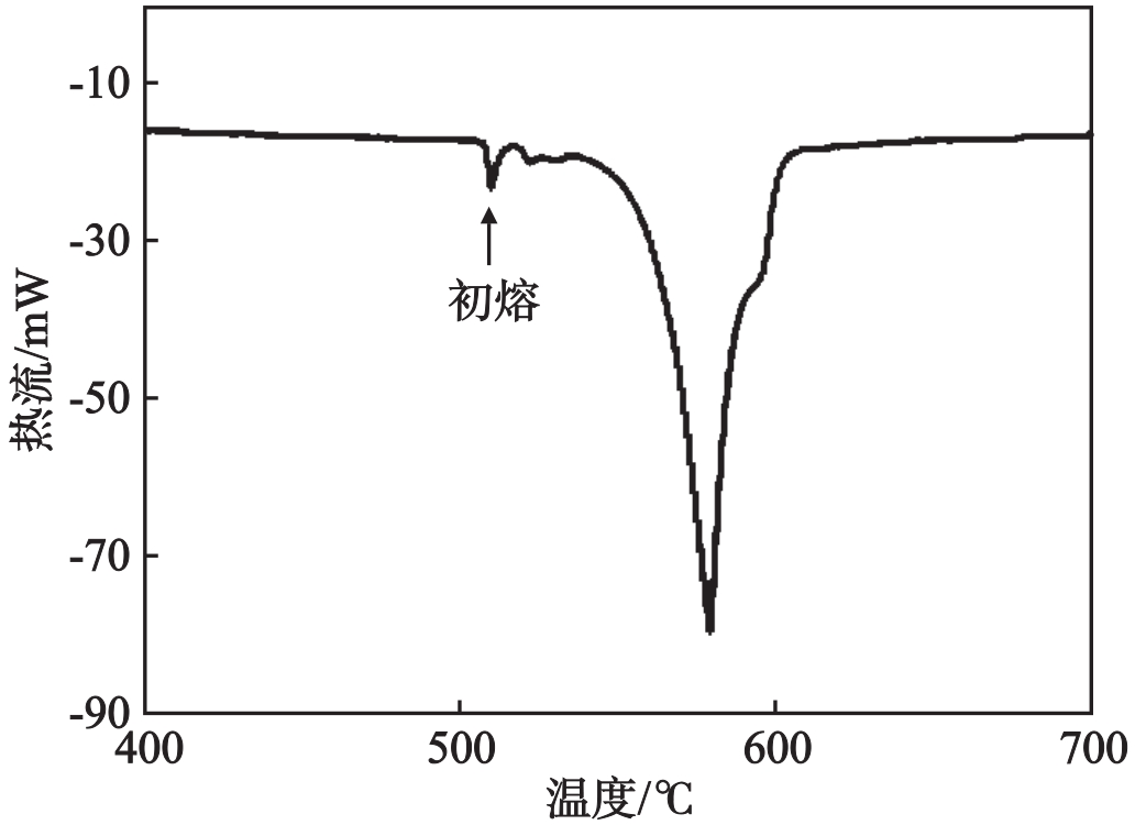 圖2 鑄態鋁硅合金組織掃描電鏡圖 圖2可見,鑄態鋁硅合金組織中發現的最常見的金屬間化合物相是θ-Al2Cu相,它們以兩種不同形態存在,包括塊狀(表示為θb ,圖2a)和共晶狀(表示為θe,圖2b)。根據現有研究可知,β相為Al5FeSi相,π相為Al8Mg3FeSi6相,而Q粒子呈現為在光滑邊界的規則塊狀(圖2a)。Q粒子與θ-Al2Cu相結合時,化學成分與Al5Cu2Mg8Si6相一致(圖2c)。這歸因于這些相是在凝固過程中最終的共晶反應中形成的。對鑄態合金進行差熱分析發現了一種低熔點化合物,其特征是在507 ℃開始反應,在509℃達到峰值(見圖3)。