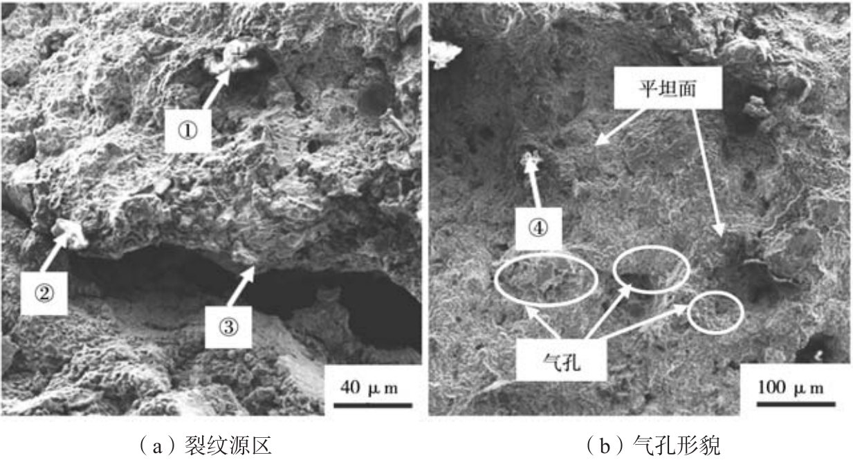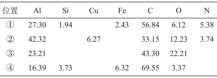 圖2 熱裂處斷口形貌特征 可以判斷出熱裂發生于晶界處,這是由于當合金凝固至半固態階段時,晶界處熱應力逐漸增加,此時合金的強度極限較小,材料半固態的強度極限低于晶界處的熱應力所致,即在凝固的最后階段由于收縮所產生的應力應變超過材料可承受的極限范圍,這是熱裂的主要誘因。此時產生的熱裂紋不能及時愈合,合金的強度就會下降,而熱裂紋就會發生進一步的擴展。從圖2b中可以看出,斷口中存在脆性斷裂區域和韌性斷裂區域,以脆性斷裂為主,斷口裂紋內部某些區域,集中分布著大量孔洞,初步判定是氣孔,由于孔洞數量較多,且分布范圍廣,相對密集,可以判斷為壓鑄時卷氣及排氣板等廢料回用產生的氣孔,它們嚴重降低了合金的力學性能。而且氣孔周邊分布有大量夾雜物。圖2中各點的EDS微區成分分析結果見表2,從表2中可以看出,各點均含有碳、氧、氮、鋁、硅、鐵元素,推斷主要為碳氧氮夾雜物及有害鐵相(β-AlFeSi),且可以推測夾雜物來源于壓鑄過程中的輔助材料,如脫模劑、顆粒油等,導致試樣呈現脆性斷裂特征。
