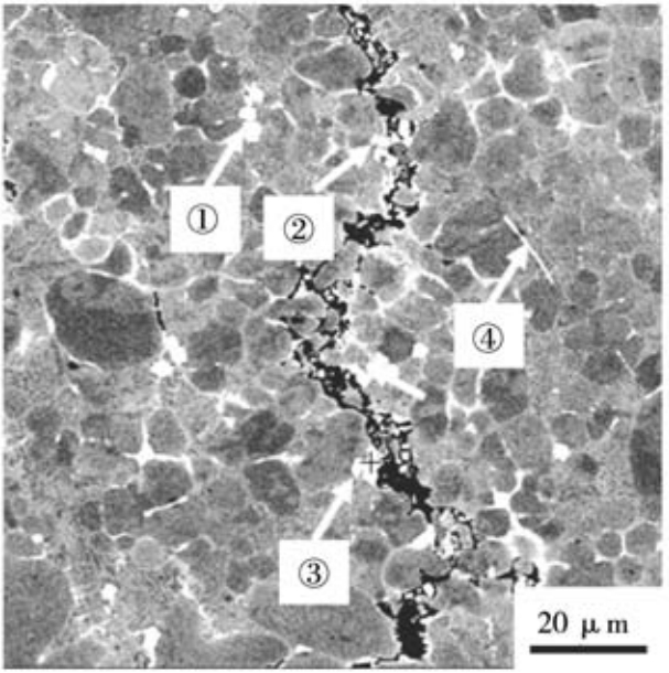 圖3 熱裂紋處合金的顯微組織 為進一步分析熱裂處的微觀組織形貌,對合金試樣進行掃描電鏡觀察,并對熱裂紋處的特征部位進行能譜分析,結果分別如圖4及表3所示。可知微觀組織中白色塊狀及針狀組織的成分含有鋁、硅、鐵元素,判斷為β(Al 9 Fe 2 Si 2 )脆性相,大量尺寸較大的塊狀β-AlFeSi相在裂紋兩側,且分布雜亂無章,阻塞了枝晶之間的補縮通道,使共晶液補縮較為困難,同時增加氣孔缺陷,因為β-AlFeSi相有著較小的氣體-固體界面能,所以氣孔容易沿著β鐵相形核并長大。另外,粗大的有害鐵相會對合金的補縮造成影響,阻塞了液體補縮的通道,因而進一步增加合金的熱裂傾向 。