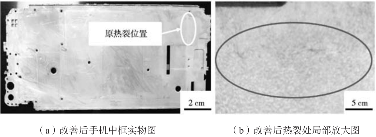 表3 圖4中各點的EDS分析結果 wB/% 2.3 改進措施及效果 針對ADC12手機中框生產過程中出現的熱裂缺陷,提出以下改進措施: