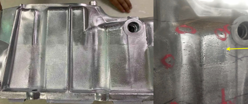 輔助氮化或者涂層,可以進一步改善沖蝕現象。 二、龜裂:由熱交變應力,拉應力,塑性應變綜合作用引起的失效形式。如圖4所示,產品表面呈現缺料,裂紋缺陷。