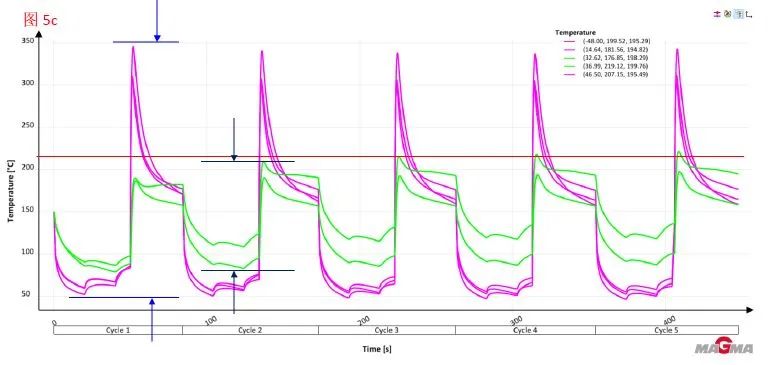 圖5 模具溫度結果與溫度曲線結果 同時,如圖5c所示,一共5條曲線,三條紫色曲線為缺陷模具表面取點生成,兩條綠色曲線為無缺陷模具表面取點生成,圖片顯示了5個生產循環。通過觀察曲線的變化規律可以發現,在每個生產循環中,缺陷模具表面的溫度曲線變化劇烈。 缺陷判斷結果小結:模具溫度結果,溫度曲線結果等。 對策:提高模具材料的硬度,強度,韌性,延展性,導熱性均可改善龜裂現象。