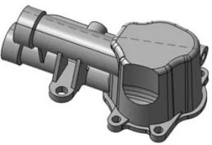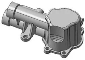 圖11 充型過程和凝固過程的溫度場 可以看出,在充型時,兩股金屬液匯入一起,未出現臺階面的情況,并且在液面升到上側的薄壁部分時,金屬液平穩上升,未出現紊流、飛濺的現象。在凝固時,除了較遠處先進行凝固之外,由于冷卻系統的加入,出現縮孔的部位在周圍較薄的部位開始凝固之前已經開始發生凝固,在周圍薄壁部分失去補縮能力后。同時,由于加工余量的設置,加工孔位置厚度增加,導致該處凝固緩慢,對周圍進行補縮。同時,由于左側澆注位置的改變,在凝固到底部兩個圓筒時,澆注口距離圖7F處預測會產生縮孔位置較近,可以有效的進行補縮。 工藝優化成形后鑄件的縮松、縮孔分布如圖12所示,可以看出,由于工藝方案的改進,底部的縮松、縮孔全部轉移到了孔加工的部位,其他部位的縮松、縮孔也由于冷卻系統的增加得到了消除。 為進一步驗證優化后的變速器操縱盒工藝方案的可行性,根據上述優化方案對產品進行試制,試制產品如圖13所示,經檢驗,產品整體質量較好,內外表面無裂紋、縮松、縮孔等缺陷,并且將零件剖開,觀察易產生縮松、縮孔的圖7中的F和G處,也無缺陷產生,與上述模擬結果相吻合,說明澆注系統和冷卻系統的優化設計較為合理。