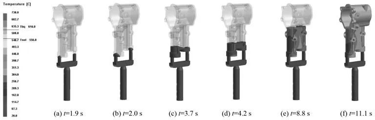 表2 冷卻水管參數 4.2 方案驗證 對優化后的工藝方案進行數值模擬,充型過程和凝固過程的溫度場如圖11所示。