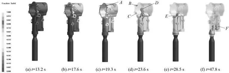 圖5 方案二的充型過程 在進行充型時,兩種方案都比較符合一般低壓鑄造的自下而上的填充,但是方案一在充型時鋁液在壁厚變化較大的部位出現臺階面,方案二較為合理,但還需再做進一步優化,且充型都提前完成,因此需要對壓力曲線進行修改。 3.2.2 凝固過程和缺陷的分析 在凝固過程中,金屬液在型腔中逐漸結晶,形成固液共存的狀態,金屬液存在一個臨界固相分數,當超過此臨界值,金屬液流動性將變差,以至于失去補縮能力,理論上取臨界固相分數值為0.7。因此對兩種方案的凝固過程主要分析固相率變化,方案一和方案二的凝固情況分別如圖6和圖7所示。