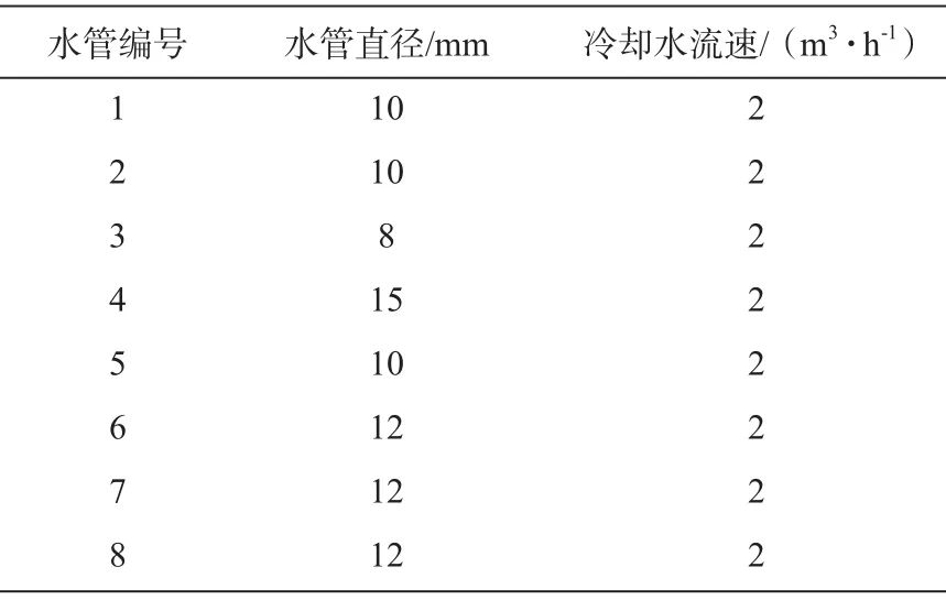 圖8 兩種方案的縮松、縮孔所在位置 4.工藝優化 4.1 優化方案 綜合比較兩種澆注系統,方案二較方案一在充型過程中較為合理且縮松、縮孔體積較小,所以選擇方案二并對其進行進一步工藝優化。 在充型過程中,針對在鋁液充型30%的時候出現的短暫臺階面,調整兩個內澆道的截面積,但保證總面積不變,這樣使得充型到該處時兩側液面更平穩,減少因金屬液紊流、飛濺而導致的氣孔、氧化夾渣等缺陷。針對圖7F處產生的較大縮孔,調整左側內澆道的位置,這樣澆道位置與出現缺陷的F處較近,便于補縮,改善此處內縮孔情況。 由于距離澆口遠處的薄壁部分厚度較為不均,較厚的部位在凝固之前周邊部位已經凝固,無法進行補縮,針對由于此原因產生的縮孔,采用添加冷卻系統的方法,調整凝固時溫度場的分布,得到較好的凝固順序。冷卻系統采用水冷的方式,水溫選擇15 ℃。 對于孔部位的缺陷,由于此處厚度差異較大,因此在此處添加冷卻水管效果不太顯著,因此可以將孔處添加加工余量,將孔填上,后續再進行孔加工,添加的加工余量可以起到補縮的作用,再通過冷卻水管將縮松、縮孔的位置調整在加工余量范圍內,后續孔加工時進行去除。 綜上所述并結合數值模擬,優化后的澆注系統優化結果和具體的冷卻分布位置如圖9和圖10所示,冷卻水管的參數如表2所示。