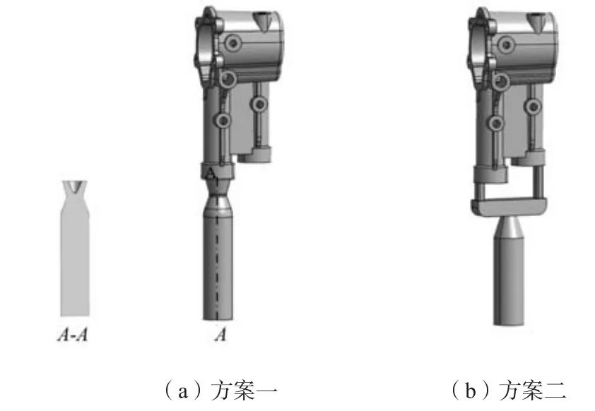 式中:∑A內 為內澆道的總截面積,G為零件的質量,ρ為合金液的密度,v為充填速度,t為充填時間。合金液密度為2.4 g/m³ ,取充填速度為15 cm/s,t可以通過型腔高度與型腔內金屬液升高速度比值確定,由于平均壁厚為4.6 mm,根據經驗取充填速度2 cm/s,通過計算得出內澆道的截面積為188 ㎡ 。 根據常見的澆注系統中組元的截面面積比例關系可得,∑A內∶∑A橫∶∑A直=1.0∶(1.5~1.7)∶(2.0~2.3)。通過經驗和模擬計算總結,取∑A內∶∑A橫∶∑A直=1.0∶1.7∶2.3。因此本次鋁合金操縱盒低壓鑄造的橫澆道和直澆道的截面積分別為320 ㎡ 和432 ㎡ 。 2.2.2 升液管設計 升液管目前多采用鑄鐵材料,但是鑄鐵材料壽命短易腐蝕并且會導致金屬液增鐵,所以本次使用陶瓷升液管,升液管的高度以升液管底端距坩堝底部距離為基準設定。 2.2.3 澆注系統設計 低壓鑄造的澆注系統結構必須充分考慮低壓鑄造自下而上的填充順序和自上而下的凝固順序,且通過設計底注式澆注系統,保證鐵液上升時充型平穩,減少因紊流產生的氧化夾渣。本文共提出兩種澆注系統方案,其中方案一為單升液管單澆道,受零件形狀的限制,內澆道設計成環狀澆道;方案二為單升液管多澆道,內澆道為橢圓形澆道。結合上述計算的澆注系統的截面積大小,設計出方案一和方案二的澆注系統如圖3所示。