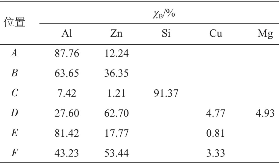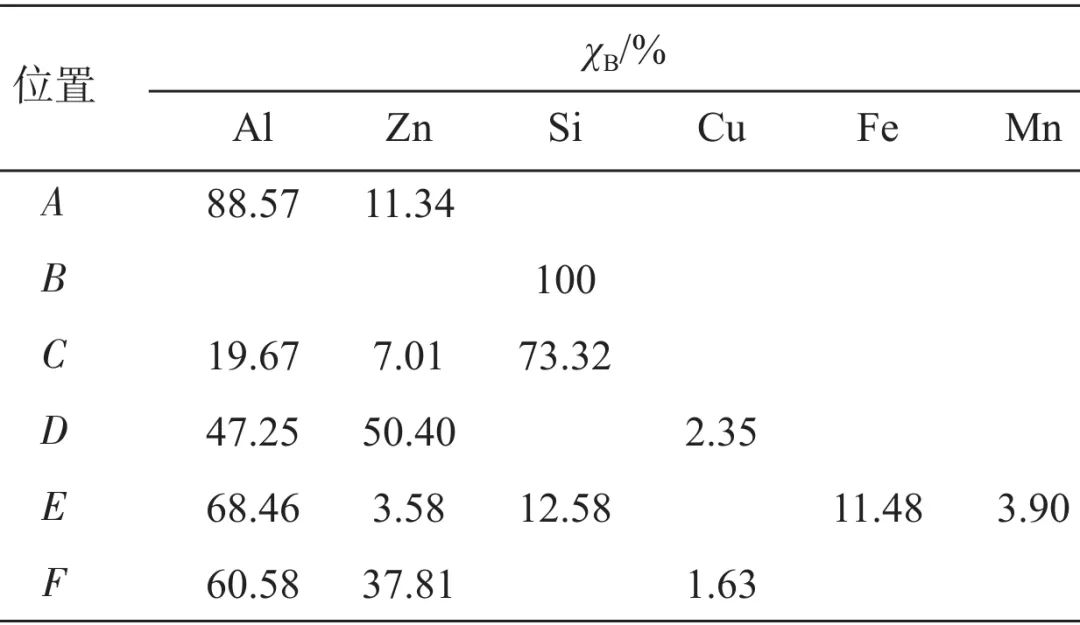 表4 高壓鑄造2號(hào)合金EDS成分 與2號(hào)合金相比較,3號(hào)合金晶界處第二相的數(shù)量明顯增加,未發(fā)現(xiàn)初晶硅相,共晶硅的數(shù)量有所減少,固溶于α-Al中的Zn元素增加,如圖6及表5中A處所示,Zn含量達(dá)12.24at%;晶界處白色網(wǎng)狀物質(zhì)主要為α+η富鋅相,如圖6及表5中B、D、F所示,黑色塊狀物為初晶硅;結(jié)合元素掃描分布圖,與2號(hào)合金相比較,Cu和Zn元素在晶界處的偏析程度增加。