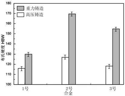 表5 高壓鑄造3號(hào)合金EDS成分 第二相強(qiáng)化的合金,當(dāng)?shù)诙喑示W(wǎng)狀分布于晶界上時(shí),與基體結(jié)合的強(qiáng)度相對(duì)較低,微裂紋容易發(fā)生于第二相與基體的界面處,由于能量釋放導(dǎo)致裂紋擴(kuò)展,降低了合金的塑性與強(qiáng)度。當(dāng)合金中的第二相分布為斷續(xù)點(diǎn)狀時(shí),相應(yīng)的臨界切變應(yīng)力會(huì)提高,尤其是硬質(zhì)相質(zhì)點(diǎn),位錯(cuò)需要繞過(guò)它才能繼續(xù)滑移,嚴(yán)重阻礙了位錯(cuò)的滑移,位錯(cuò)堆積會(huì)產(chǎn)生應(yīng)力集中,引起開(kāi)裂的機(jī)會(huì)大,造成塑性降低。第二相為不規(guī)則形狀具有尖角時(shí),在外力作用下,尖角處易形成應(yīng)力集中,使裂紋容易在此處形核和長(zhǎng)大,從而降低強(qiáng)度和塑性。2號(hào)合金中尺寸不規(guī)則的初晶硅相及枝晶間連成網(wǎng)狀的富Zn相受外力作用時(shí)容易產(chǎn)生應(yīng)力集中,從而導(dǎo)致合金的塑性降低。 2.3 力學(xué)性能分析 在室溫下對(duì)2種鑄造方法制備的試樣進(jìn)行力學(xué)性能測(cè)試,結(jié)果見(jiàn)圖7。可以看出,兩種鑄造方式下的3種合金塑性都較差,高壓鑄造下合金的塑性低于重力鑄造,其中2號(hào)合金的塑性最差,形狀不規(guī)則初晶硅析出,尺寸變大,脆性增加,且分布極不均勻,割裂了基體。同時(shí),試驗(yàn)合金拉伸變形,首先在晶間共析相上發(fā)生,導(dǎo)致拉伸過(guò)程中硅相尖端局部應(yīng)力集中,從而導(dǎo)致硅相自身開(kāi)裂或產(chǎn)生微裂紋,重力鑄造下1號(hào)合金的抗拉強(qiáng)度與伸長(zhǎng)率最優(yōu),分別為322 MPa、1.7%。高壓鑄造下2號(hào)合金的強(qiáng)度最高,伸長(zhǎng)率最低,分別為362 MPa、0.4%。兩種鑄造方式下,3種合金的布氏硬度變化趨勢(shì)相同,結(jié)果如圖8所示,2號(hào)合金的最高,分別為HBW127(重力鑄造)、HBW170(高壓鑄造),相對(duì)于1號(hào)合金分別提升9.48%、30.76%。Si元素形成的初晶Si相,其硬度遠(yuǎn)高于試驗(yàn)合金基體,充當(dāng)支撐相,從而提高合金的硬度。