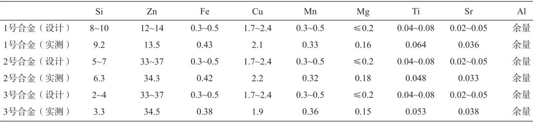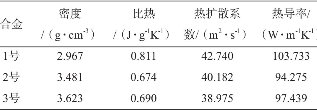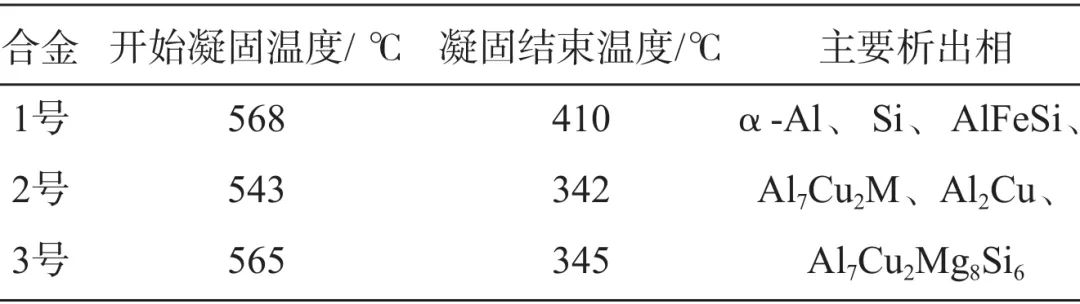 圖1 鑄件形狀和尺寸 2.試驗(yàn)結(jié)果與討論 2.1 凝固歷程分析 采用JMatPro軟件對(duì)3種合金的凝固過(guò)程進(jìn)行模擬,其結(jié)果如表3所示,可以看出,3種合金的固液相線(xiàn)相差較大,結(jié)晶范圍寬。1號(hào)合金從568 ℃開(kāi)始凝固,410 ℃凝固結(jié)束,凝固區(qū)間寬度為158 ℃,可以看出,1號(hào)合金凝固過(guò)程中主要析出相有α-Al、 Si、 AlFeSi、Al7Cu2M、Al2Cu、Al7Cu2Mg8Si6,且所有的凝固析出相均在凝固區(qū)間內(nèi)析出。2號(hào)合金的凝固過(guò)程可分為三個(gè)階段,從543 ℃開(kāi)始凝固,342 ℃凝固結(jié)束,首先形成Si相,然后形成α-Al相,最后形成富鋅相。3號(hào)合金的凝固區(qū)間為345~565 ℃,析出相與2號(hào)合金相同,但2號(hào)合金先析出α-Al相,隨后析出Si相,凝固區(qū)間變寬。