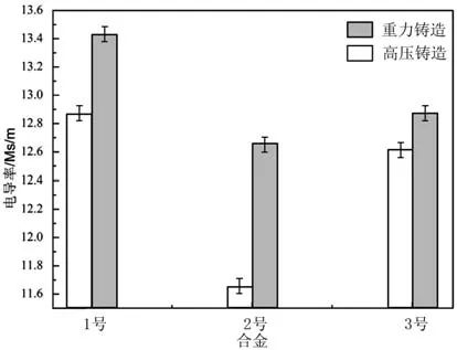 圖9 不同鑄造方式下合金的電導(dǎo)率 3.結(jié)論 (1)以高鋅AlZnSiCu鋁合金為對(duì)象,研究了重力鑄造及高壓鑄造對(duì)其組織、力學(xué)性能和熱導(dǎo)率的影響。鑄造方式對(duì)合金的組織形貌有著顯著影響,高壓鑄造相比重力鑄造,晶粒明顯細(xì)化且由柱狀晶轉(zhuǎn)化為等軸晶,初晶硅的尺寸減小,共晶硅由長(zhǎng)條狀及片狀轉(zhuǎn)化為纖維狀。兩種鑄造方式下的3種合金塑性較差,其中2號(hào)合金伸長(zhǎng)率最低,硬度最高,分布于基體中初晶硅的硬度,遠(yuǎn)高于試驗(yàn)合金基體,充當(dāng)支撐相;1號(hào)合金的熱導(dǎo)率與伸長(zhǎng)率最高。 (2)2號(hào)、3號(hào)合金Zn含量增加減少了Al與Si的共晶反應(yīng),造成共晶硅減少,形狀不規(guī)則的初晶硅增多,增加了組織的不均勻性,重力鑄造下1號(hào)合金的抗拉強(qiáng)度與伸長(zhǎng)率最高,分別為322 MPa、1.7%。高壓鑄造下2號(hào)合金的抗拉強(qiáng)度及硬度最高,伸長(zhǎng)率最低,分別為362 MPa、0.4%。 (3)3種合金熱導(dǎo)率無(wú)較明顯差異,其中,重力鑄造晶粒粗大,晶界面積較小,熱導(dǎo)率整體高于高壓鑄造,高壓鑄造下2、3號(hào)合金中固溶于α-Al中Zn元素較1號(hào)合金明顯增多,晶界處的第二相數(shù)量增多,2號(hào)合金初晶硅尺寸較大,增加了電子傳輸過(guò)程中對(duì)自由電子的散射作用,使有效傳輸通道數(shù)量減少,降低合金傳熱能力。