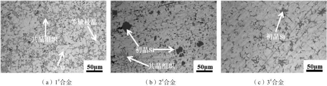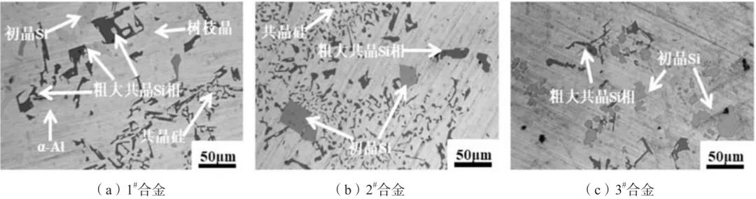 表3 3種合金的凝固區(qū)間及析出相 2.2 顯微組織分析 圖2和圖3為3種合金在2種不同鑄造方法下的顯微組織,圖2為重力鑄造的金相,α-Al晶粒較為粗大,呈灰白色,1號(hào)合金、2號(hào)合金存在黑色短棒狀或片狀共晶Si相,Sr變質(zhì)有一定的效果。灰色塊狀為初晶硅,Zn在Al中有較大的固溶度,在鑄造過(guò)程中Zn過(guò)飽和地溶入固溶體中。2號(hào)、3號(hào)合金與1號(hào)合金相比較,隨著Zn含量的增多,Al的消耗量增加,從而減少了與硅的共晶反應(yīng),共晶硅減少,造成形狀不規(guī)則的初晶硅增多,增加了組織的不均勻性,微量Sr和Ti對(duì)初晶硅形貌無(wú)明顯改善作用,雖然3號(hào)合金的硅含量較低,但是組織中也出現(xiàn)了大量形狀不規(guī)則的初晶硅,初晶硅為脆硬相,使得合金的硬度增加,塑性降低。