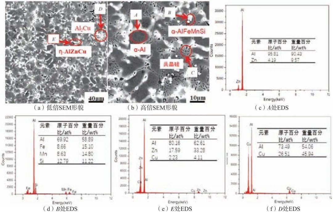 圖3 高壓鑄造合金的金相組織 圖3為高壓鑄造的金相,液態(tài)金屬壓力作用下增大了冷卻速率,減小了臨界形核尺寸,降低了形核功,提高了形核率,初生α-Al尺寸明顯減小,可以看出,1號(hào)合金中出現(xiàn)了等軸枝晶,晶粒尺寸大小不均,共晶硅的變質(zhì)效果較好且均勻分布于晶界之間,未發(fā)現(xiàn)有初晶硅。2號(hào)、3號(hào)合金中出現(xiàn)大量形狀、尺寸不等的初晶硅,且隨硅含量減少,α-Al尺寸增大,分布于晶界間的共晶組織明顯減少。為進(jìn)一步觀察高壓鑄造下的3種合金組織,采用掃描電鏡對(duì)高壓鑄造下3種合金的形貌及第二相成分進(jìn)行分析。 圖4為高壓鑄造下1號(hào)合金的SEM照片及EDS能譜分析,可以看出,深灰色的為基體相(Zn固溶于α-Al基體中),如圖4b中的A處所示,能譜分析Zn的含量4.19at%,黑色的纖維狀和小塊狀為共晶硅相,共晶硅的整體變質(zhì)效果較好,如圖4b中的C處所示。圖4b中亮白色的小圓點(diǎn)為α-AlFeMnSi相,Mn的加入有利于降低β-Fe 富鐵相的優(yōu)勢(shì)生長(zhǎng)取向,可抑制 β-Fe富鐵相的形成,促進(jìn)β-Fe 相向α-Fe富鐵相轉(zhuǎn)變。分布于晶界處白色物質(zhì)為富Cu金屬間化合物,如圖4a中標(biāo)記D所示,其主要組成元素為Al和Cu,根據(jù)元素含量配比,判斷其為θ-Al2Cu相,其彌散分布于晶界,割裂基體,提升合金強(qiáng)度和硬度的同時(shí)降低了塑性。由于固溶體相α-Al所占體積分?jǐn)?shù)遠(yuǎn)大于晶界相,因此只有少量的Zn與Al、Cu結(jié)合在晶界上形成金屬間化合物AlZnCu相,如圖4a中標(biāo)記E,而大部分 Zn元素以固溶形式存在于α-Al中。