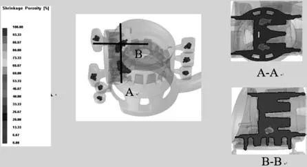 圖7 鑄件完全凝固后的溫度場 圖8為鑄件采用澆注系統I所產生的縮孔、縮松缺陷。鑄件產生缺陷集中的地方是鑄件加強筋壁厚較大的地方,其原因是鑄件在此區域凝固時溫度較高,金屬液凝固較慢,凝固速率不均勻,此時會產生細小的孔洞被孤立,從而在完全凝固時得不到金屬液的補縮,出現縮孔、縮松缺陷。